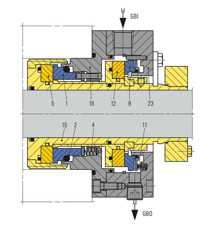 Gasgesperrte Doppeldichtung. Die HRGS-DC findet Anwendung, wenn die Anschlussmaße nach DIN 24960 C oder nach ANSI Big Bore Standard zu beachten sind. Auch wenn die Anschlussmaße nicht genormt sind, aber offene, große Einbauräume zur Verfügung stehen, ist sie einsetzbar. Als atmosphärenseitige Dichtung wird bis Nennweite 125 die CGSH eingesetzt.